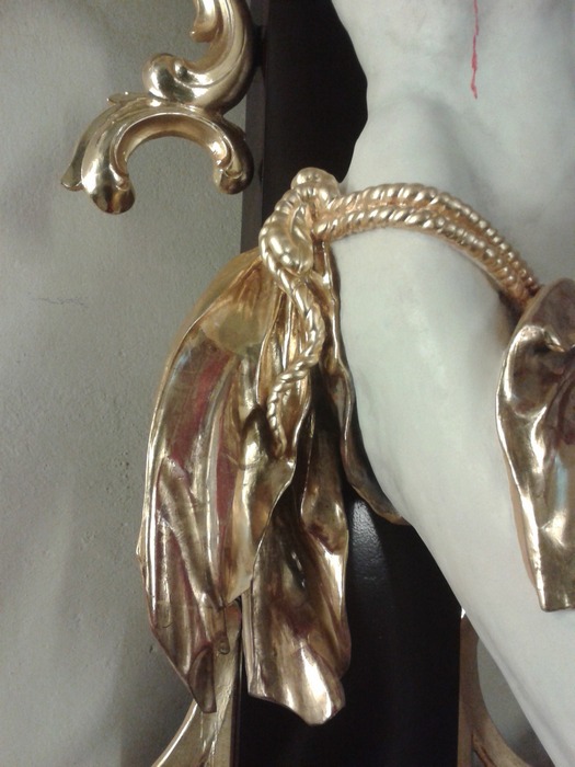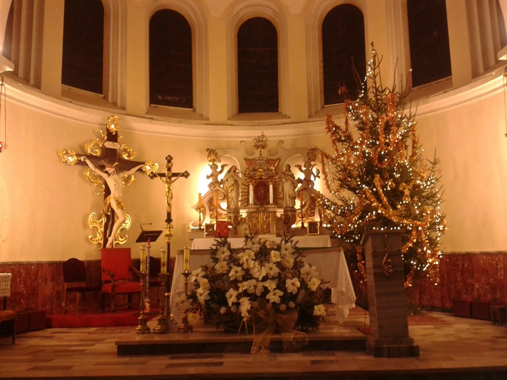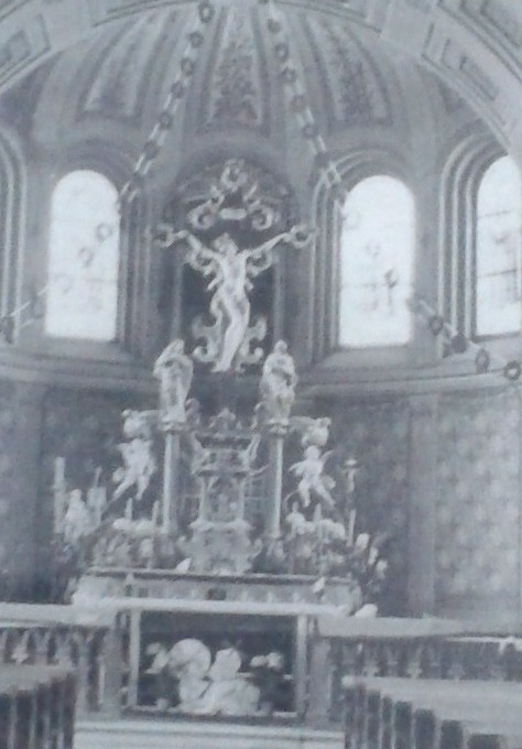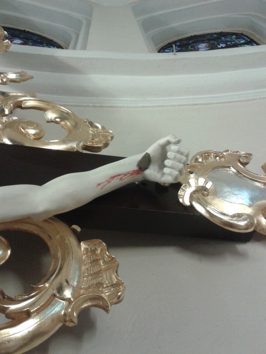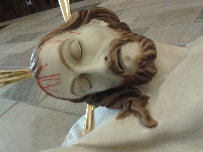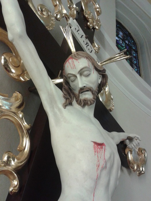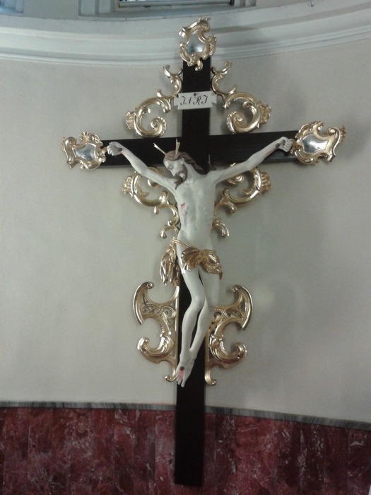 Tak wygląda krzyż po renowacji. Na czas renowacji ołtarza głównego został umieszczony na ścianie prebiterium, ale wróci na swoje miejsce w ołtarzu głównym wg zamierzeń budowniczych kościoła.